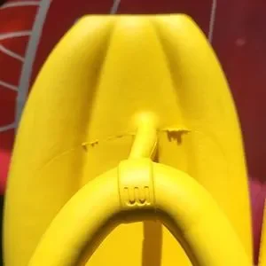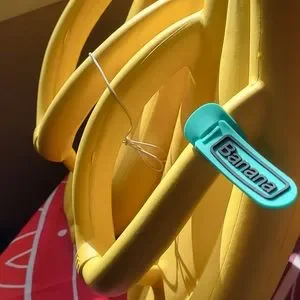 Bright yellow banana thong sandal with a cute little teal "banana" band as if they were labeled for purchasing a bunch!!