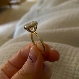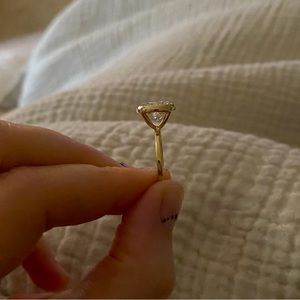 Stunning custom ring! 10x8 Moissanite (roughly 2.5-3ct) with custom made 14kt gold bezel setting. Less than a year old and very lightly worn.