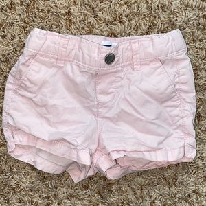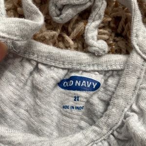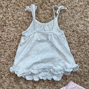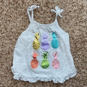 2-piece girls size 2t set. Light pink chino shorts with internal belt for enhanced fit - some discoloration at butt, pictured. Gray tank top with faux ties at shoulders and ruffle at hem. Colorful shiny pineapples across chest.