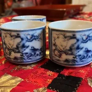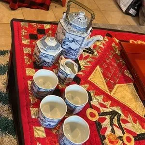 Vintage of Chinese teapot and 4 cup, and one sugar cup and one milk cup everything is seven pieces, Chinese dynasty, set blue and white. Very beautiful almost new.