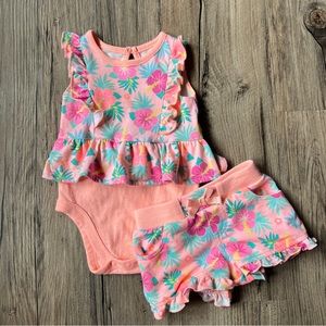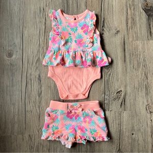 2 piece set for baby girl 🌴 vacation vibes for spring and summer! A one piece bodysuit that buttons at the bottom and a matching set of shorts - makes it look like one piece when put together! Tropical hibiscus flowers with bright orange, pink, and greens give a bold and fun aesthetic.