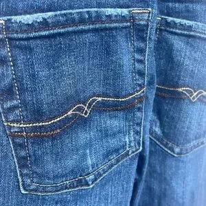 Distressed with stitching on back pockets.