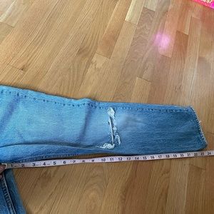 Please check photos for other measurements and compare to your other jeans. These have a vintage wash and a hole in the knee. Great condition.
