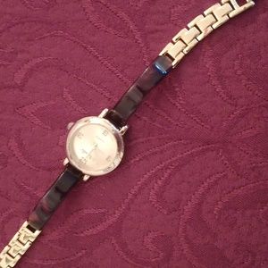 4 vintage watches, I don't know if they work. Never tried to replace the batteries. 3 of them have hinged bands. The tiger striped with silver toned finish is a Geneva brand. The gold finish with brown tortoise trim and clasp closure is a Novella brand. The blue one is a Geneva brand. The gold cross hinged brand is also Geneva.