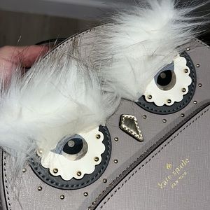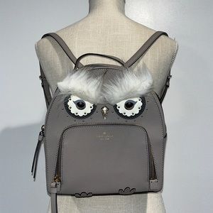 So adorable Star Bright Owl Tomi backpack in light gray saffiano leather by kate spade. No detail is lost on this magnificent piece! From the metal nose to the little toes, this bag is a piece of art! Interior features one slip pockets. Front zip pocket as well. Adjustable straps. Excellent condition with no rips, tears or stains.