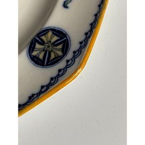 Very good previously owned condition. shows slight loss of orange color on rim of plates and can be seen in photos.