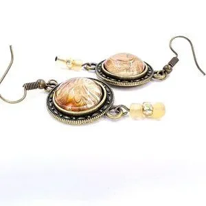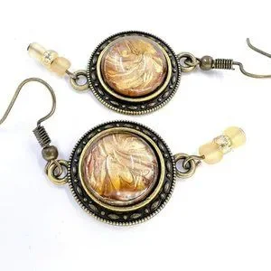 New / Handcrafted - Beautiful Copper & Gold Paint Skin Beaded Fishhook Earrings. BOHO vibes brass tone drop earrings are 2” in total length, the round section is 7/8” in diameter, and the beads are .5” long. Cabochon is domed and is made of glass. Earrings are new and are in excellent condition.