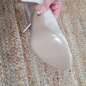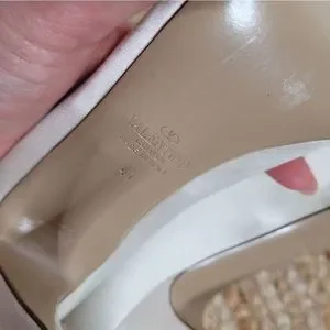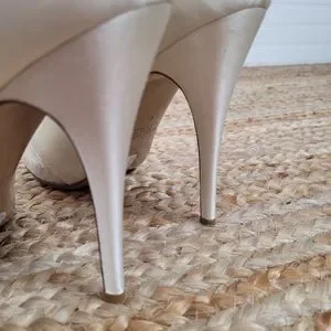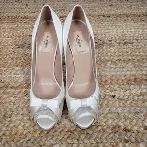 Brand new without box Valentino ivory white satin platform pump with an open toe, lace and bow. There is some discoloration where the glue is around bow area. These are dyeable shoes and can be dyed to any color you wish.