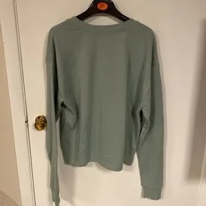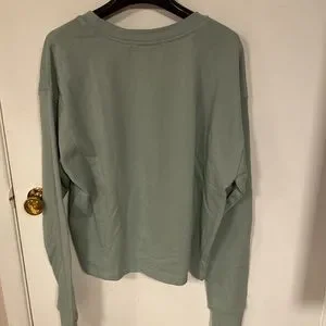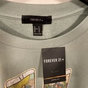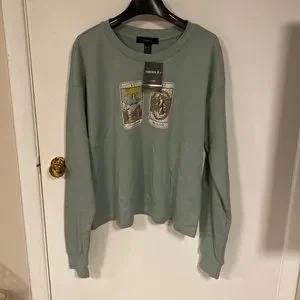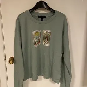 The tag says it’s a cropped sweatshirt and while it is a tad bit shorter, I don’t necessarily think it’s cropped. The sleeves are longer than the bottom hem, though. Brand new with tags! Never worn. Pretty sage green color with astrology cards graphic design.
