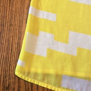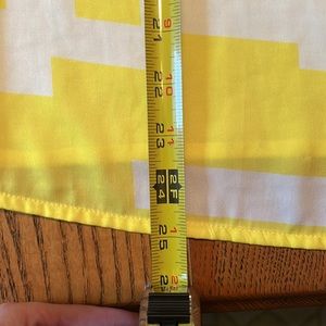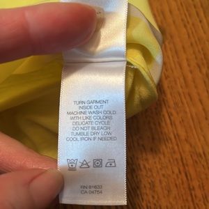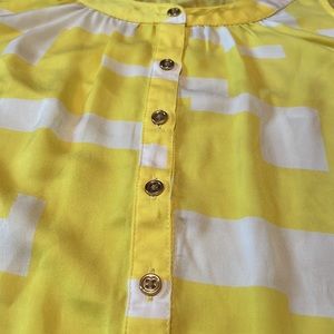 Love this beautiful color! Such a bright yellow. Approximate measurements are 18 inches pit to pit and 25 inches from shoulder to bottom of top. The front is a polyester and the back half is more of a T-shirt material with a mix of rayon. Has five button down the front that are gold in color. Does have a bit of a stretch for added comfort. As always smoke and pet free home, same day shipping and willing to negotiate prices.