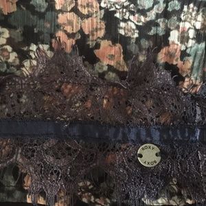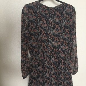Multi-colored floral print dress, faux wrap/keyhole top with lace trim, ruffled skirt with lace trim, sheer long split sleeves with elastic cuff. Elastic waist. Size M.