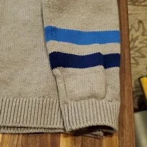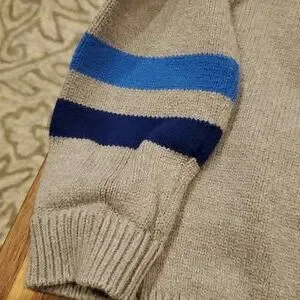 Excellent preowned condition, slight pilling. gray background, stripes on sleeves. Soft cotton/acrylic mix. Size 7/8. Smoke-free home.
