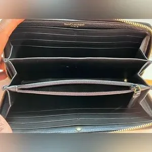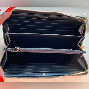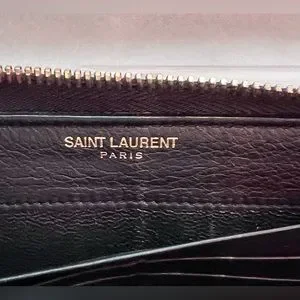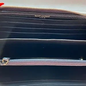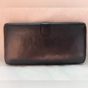 Yves Saint Laurent Wallet in black leather with Gold-Tone-hardware, leather lining & single interior pocket with card slots and a snap closure. This beautiful wallet comes with 2 bill slots, 12 card slots, 1 additional component & 1 zipper compartment. Wallet also includes COA. Made in Italy.