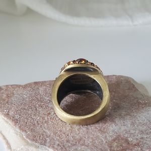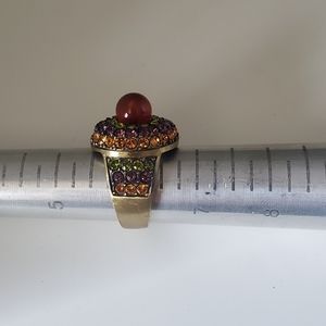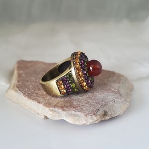 Beautiful Heidi Daus blingy ring. A carnelian orb is the the centerpiece of this pretty antiqued bronze ring. The carnelian center stone is framed by a pave of green, purple, and orangey-yellow Swarovski crystals, and finished on each side with the same crystals. Gorgeous!