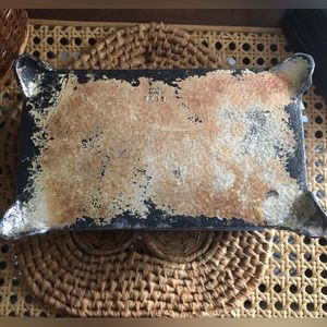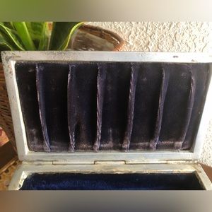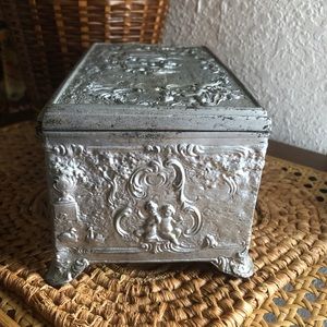 If you've got elegant jewelry, you need an equally elegant box to store it in... and here you have it! The embossed decor features life scenes of a courtesan of the 19th century. The inside has been covered with blue velvet. The antiqued finish to this piece really makes this more than stunning. Unlike many other antique jewelry boxes you may find the lid and hinge on this one is in great condition and in complete working order. The velvet insert is slightly fragile when being removed or inserted but the velvet lining is in great condition. There is a maker mark on the bottom as shown however I cannot read the first two letters but underneath it reads USA and 2805. I can tell this piece is cast, very heavy, and it is nonmagnetic, however, I can not be certain as to the exact metal type. Great vintage condition with wear expected as of the age of this piece.