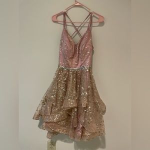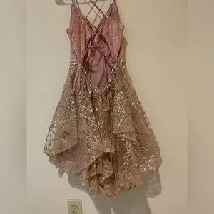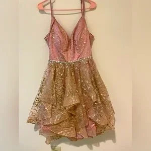 Beautiful Custom Made Dress. Almost new, worn once at my daughter’s sweet 16. Color is Rose with gold over skirt, and pretty sequins patterns. Great Prom Dress!