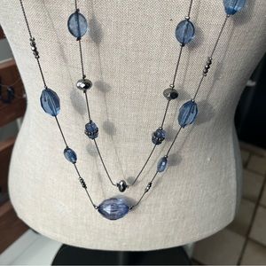 This lovely necklace features a black colored chain and different sized blue faceted beads in stations. The necklace is two strands. It’s a great layering piece.