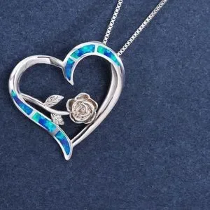 🆕 | Blue Simulated Opal | Rose Flower | 14K White Gold Plated Women’s Necklace