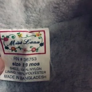 Size 18 mos. Brand is Miss Lana. Inside is a material similar to fleece