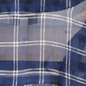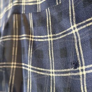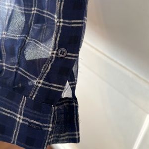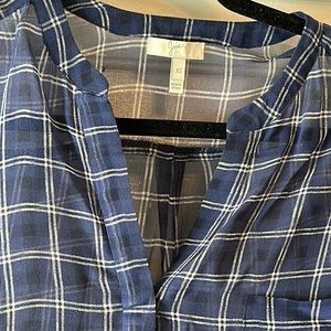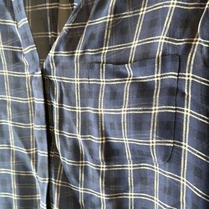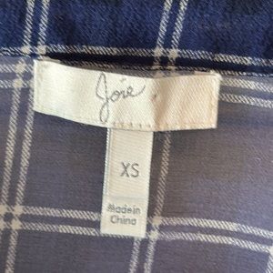 Women’s Blue Silk Joie sheer blouse with collarless neck and pocket. Blue with cream colored checkered pattern. Tres sexy. Small hole see picture