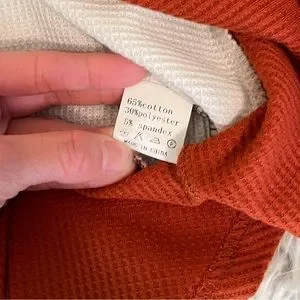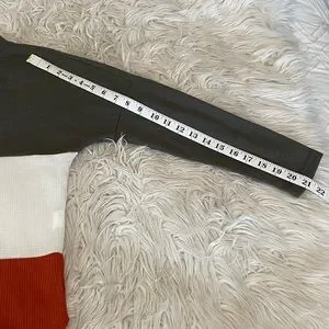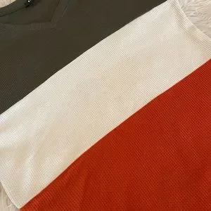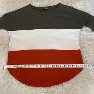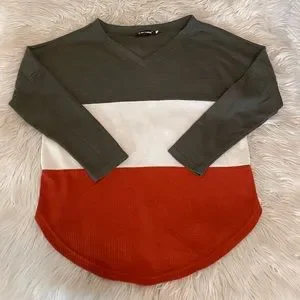 Super cute Colorblock top with v neckline and great colors. Olive green, rusty orange and cream. The cream does show some mild signs of wear. Please consider the pics for this before buying. It’s not real noticeable just know that it has been worn and isn’t in perfect condition. Does comes from a smoke free home. Pair with denim. Can easily be layered. I actually wore a striped cream and black top under it. C all pics b4 purchase 4 details, condition and sizing measurements. Thanks for looking!!