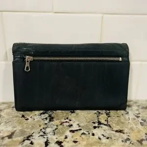Classic nylon and leather large wallet from PRADA‼️ Triangle logo, double snap closure. Tons of storage! Card slots, a zip pocket and multiple open pockets! Exterior zip pocket on the back. Good pre-loved condition. The interior is clean overall. Some wear on exterior as shown and reflected in price.