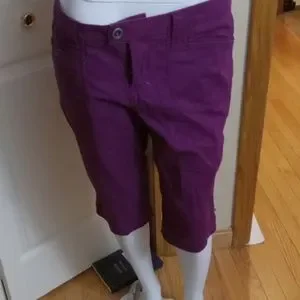 Size 10 petite capris in purple, with buttons on the bottom. At 5'5", I wore them as Bermuda shorts. Great for the office or classroom (I wore them as a preschool teacher).