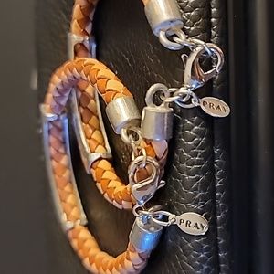 Brown leather & silvertone Pray bracelets.