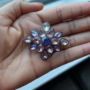 Gorgeous rhinestone vintage brooch from Liz Claiborne. Marked LC. Purple, pink colors. Gunmetal color on back. Wonderful preowned condition.