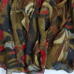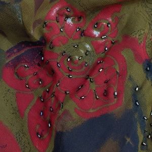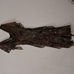 New Directions dark floral print with sequin and beaded accents size 4. 18 inches pit to pit, 14 inches flat lay across waist and 46.5 inches shoulder to hemline.