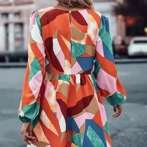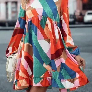 Multicolor Boho Womens Geo Print Lantern Sleeve Ruffle Hem Smock Dress