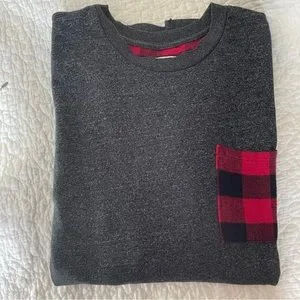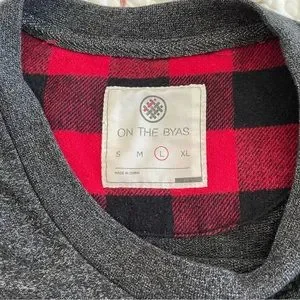 This long sleeve On The Byas shirt is made of a light weight sweatshirt type material( cotton/polyester blend). It has a red and black flannel pocket on the front and accent inside. It is a size Large. The shirt is in excellent condition-no pilling, stains, tears.