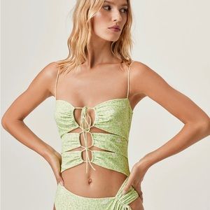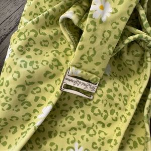 This '90s-inspired one-piece features a two-tone cheetah print with dainty daisies and drawstring cutouts at front. High-cut leg with drawstrings for adjustable coverage. Adjustable shoulder straps, logo closures at back.