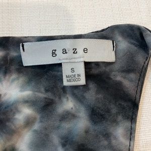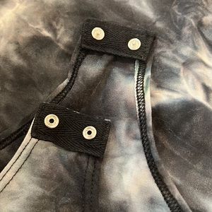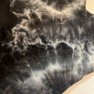 Tie dye bodysuit. Only worn a couple times. Size small. Very soft. Brand is gaze. Color is mainly dark gray/black and white but there is some blue and purply brown mixed in. Snap closure. Stretchy straps. Double lining around chest as shown inside out in last 2 pics.
