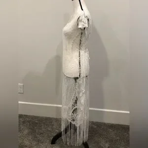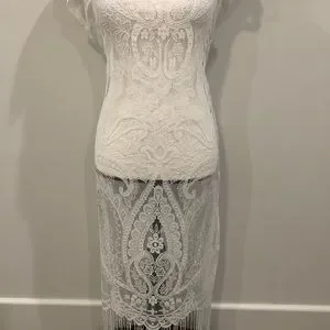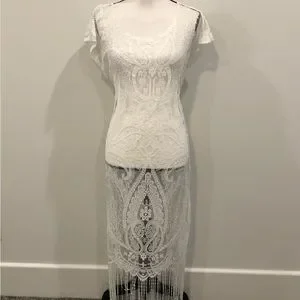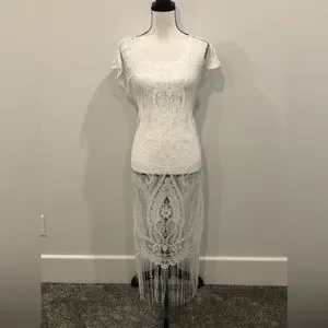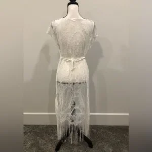 Abary bohemian lace cover up- cream. Scoop neck. Short sleeve. Slips on overhead. Ties in the back. Fringe at the bottom. Sides are slit at the bottom. One size fits most- back tie adjusts for more or less room. New!