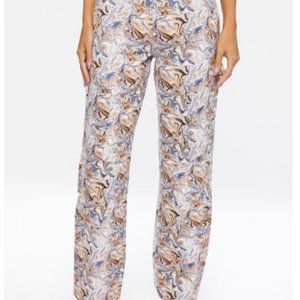 A canvas pair of pants with an allover marble print, mid-rise waist, zip fly with button closure, four-pocket construction, side utility strap, side patch pockets, and a straight leg. 100% cotton. Model is 5'7" and wearing a Small. Inseam: 30"