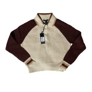 A sweater-knit top featuring a half-button placket, long sleeves, basic collar, and ribbed trim. 100% cotton