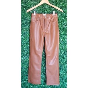 A denim fit in faux leather that is smooth on the outside and soft on the inside, a flattering high rise, and a gently flared hem. Write me with any questions!