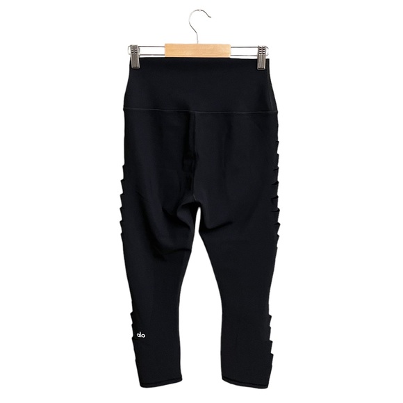 Black leggings by Alo Yoga. Distressed cut out detailing at the sides. High rise. Cropped. Excellent condition!