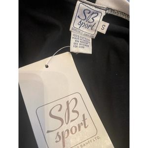 This collegiate looking deadstock cardigan has a large SB Sport emblem on the left breast, and shoulder pads. It is navy and white, v neck style, button cardigan.