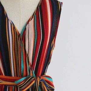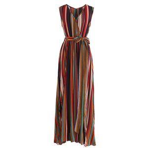 Elevate your wardrobe with this chic and sophisticated maxi dress, featuring a beautiful multi-color striped pattern. V-neckline with an elastic waist with sash to provide a flattering yet comfortable fit. The split hem adds a flirty and feminine touch, making this dress the perfect choice for any occasion. Made from 100% polyester, this dress is lightweight and breathable, ensuring you stay cool and comfortable in even the warmest weather. A must-have for any fashion-forward individual looking to stay on-trend this season. Perfect for summer!