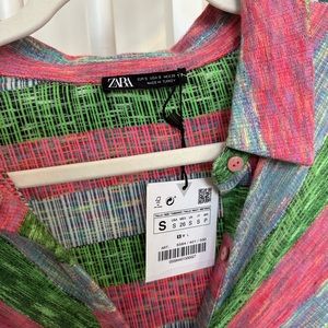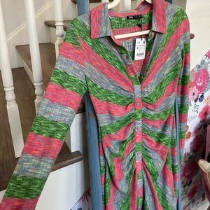 zara shirt dress with ruching size small zara long sleeves pink and green mini dress shirt with front ruching #zara #dress #summer #pink #ruching