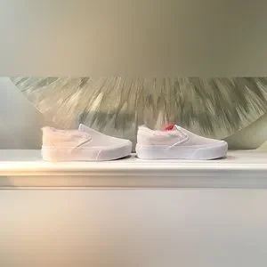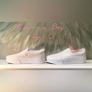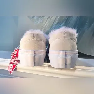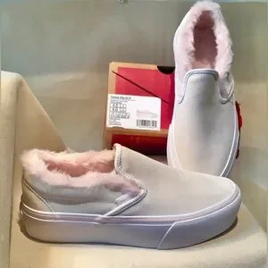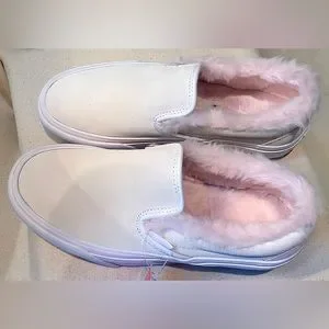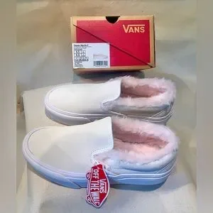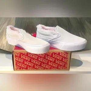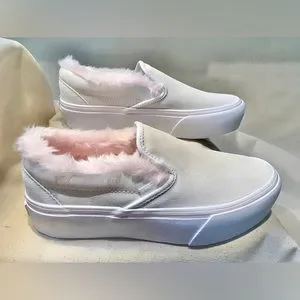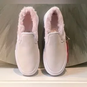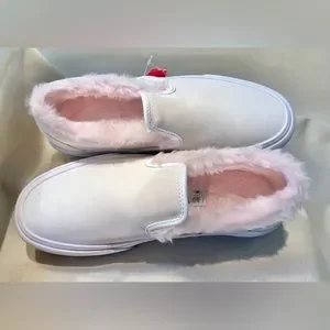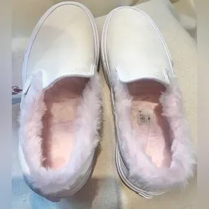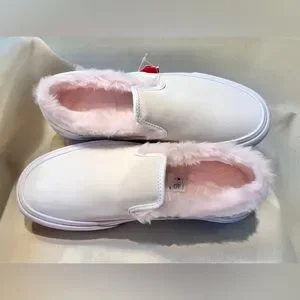 Vans ivory suede, white trim, pink faux fur lined classic slip on, NIB and with tag attached. Cute, comfy and casual. Perfect for spring and summer with athlesiure wear or with a casual dress. Size 6