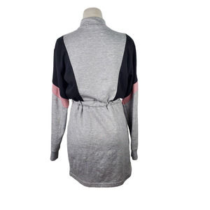 Cute casual sweatshirt dress that cinches in the waist and falls above the knees. Color block- gray, black, and pink