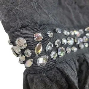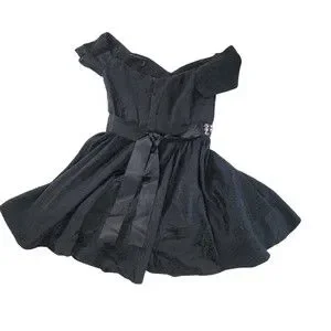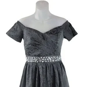 Stylish semi-formal cocktail minidress. This off the shoulder dress features gems at front beltline that becomes a belt that ties at the back. It is full lined and has a beautiful lace pattern. The bustline has light padding and top edge of bodice is rubberized to help it keep in place.