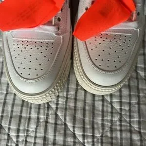Excellent condition. Worn once. The high-top basketball sneaker is reimagined with a mixed-media layered design, bright factory labels and Off-White trademarks including a zip-tie tag. Comes with box and dust bag.