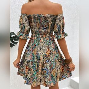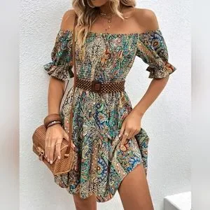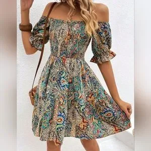 New Chic Boho Paisley Floral Off Shoulder Mini Dress Ruffle Smocked Blue Tan