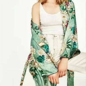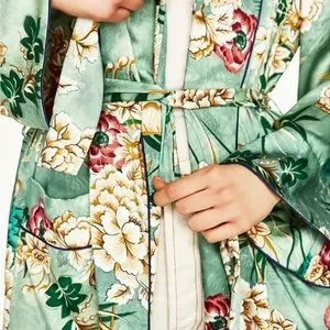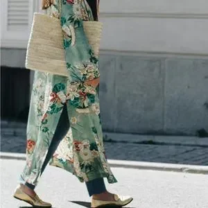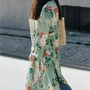 Silky polyester kimono wrap, cover up, robe, jacket. Great piece for travel, as it has so many wearable options, to dress up or down. Minty floral Green.