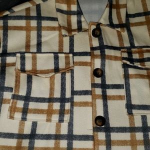 Plaid button up trench coat-like shirt jacket is super cute. I only wore it once, the arms are just a little tight on me. Its very lightweight so it works well as a spring/fall fashion coat.