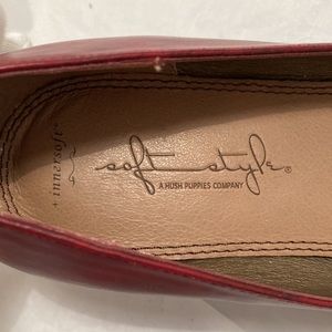 Soft Style pumps in a cranberry color. Cushioned throughout footbed, with InnerSoft technology and double stitching all around. Matching heel at approx. 2 1/2", small platform at approx. 1/4". Rubberized sole for traction. Never worn. Man made materials. Right shoe has slight imperfection, as seen in last pic, however, it's only noticeable at certain angles. Does not come with a box, but will wrap/ship with care during transit. Size 8 1/2 Medium.